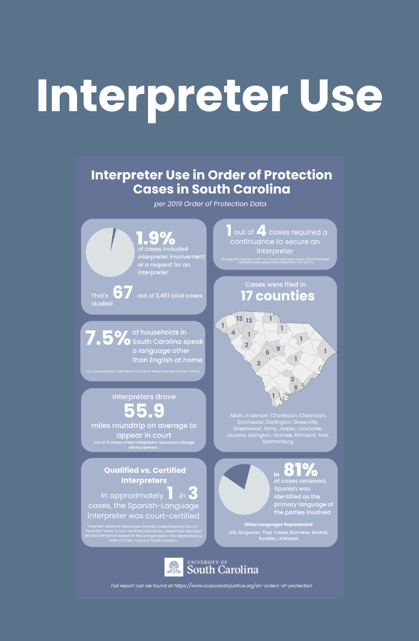 South Carolina faces both a serious, enduring domestic violence problem and significant barriers preventing access to civil justice. But, until the SC Access to Justice Commission’s recent research, little data has existed about either of these problems. This study from researchers at the University of South Carolina seeks to expand on this new body of access to justice research and fill the persistent gaps in data on domestic violence. It does so in this report by researching cases seeking Orders of Protection—the most widely used civil legal remedy against domestic violence in the state.
